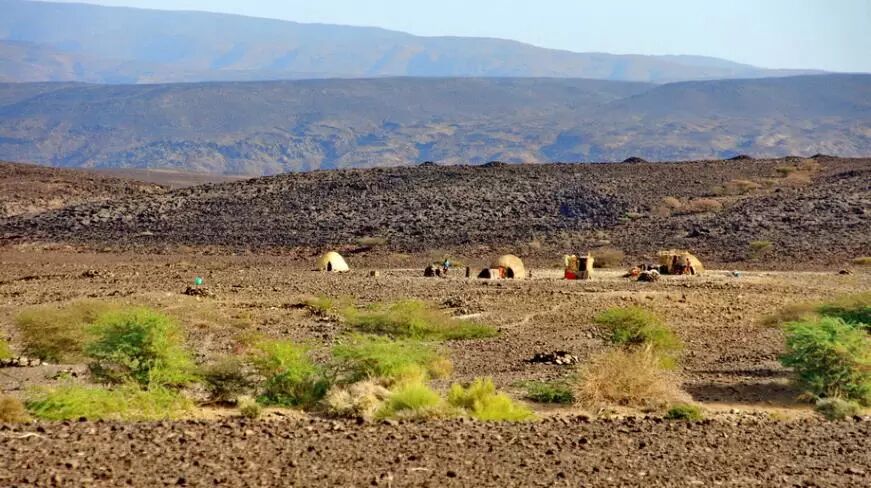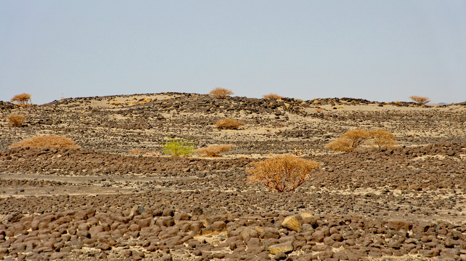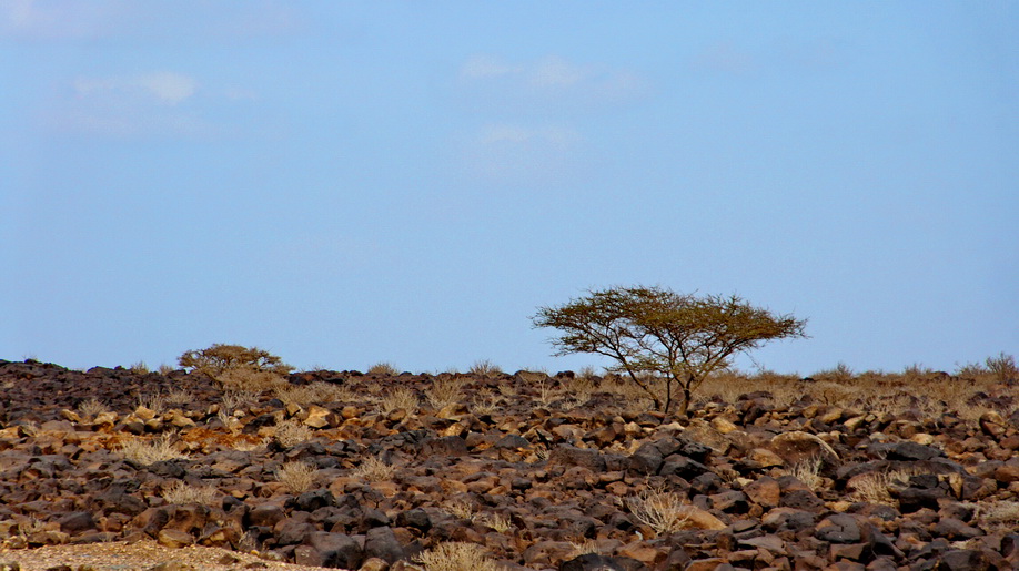 埃塞和吉布提边境的土地,黑色的岩浆冷却以后形成的石头,遍布在四周,天很热,一片焦糖,但,还有绿色!