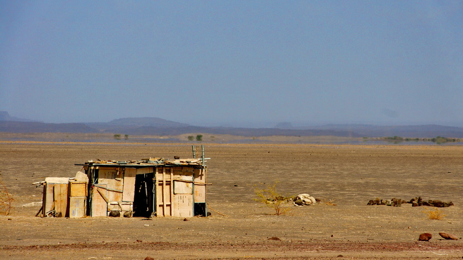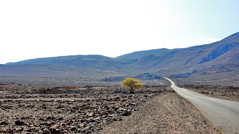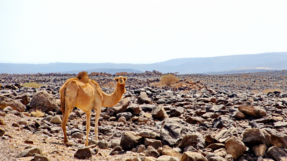 埃塞前往吉布提边境之路,这里往北,被成为地球上最热的地方。四周都是黑色的石头,吸收着太阳的热量,要把一切蒸发,但就在前方,看!还有一颗绿树,树的旁边,还有骆驼!即使最恶劣的环境,还会有坚强的生命。