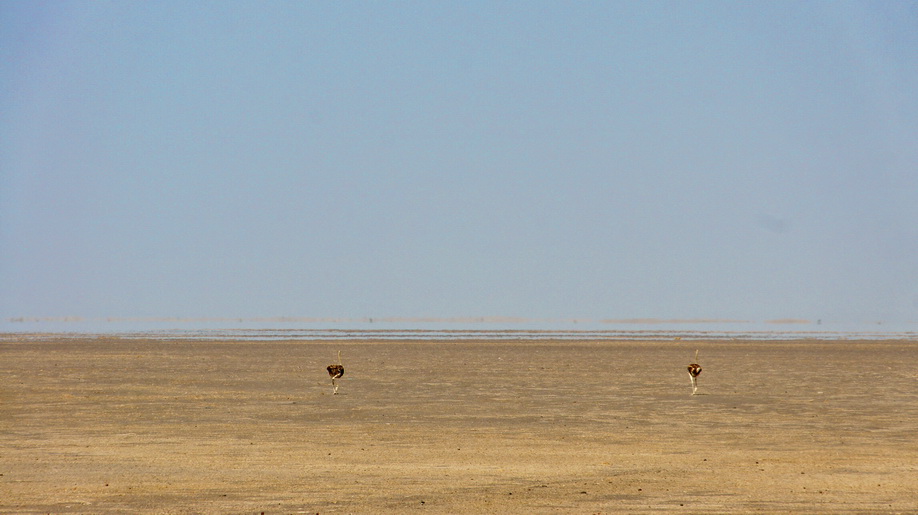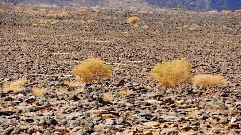 荒漠边缘,偶尔可见树林,远处,看上去像是有水的边缘,其实都是幻象。